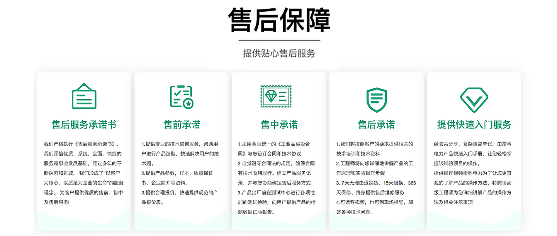 我們嚴格執行《售后服務承諾書》,我們深信優質、系統、快捷的服務是事業發展的基礎。經過多年的不斷探索和進取, 我們形成了"以客戶為核心、以質量為企業的生命"的服務理念。并以嚴格的管理、過硬的技術創建優質服務為企業為目標,制 定了"規范管理制度,嚴格過程控制,保證產品質量,達到顧客滿意"的質量方針,堅持"以客戶的滿意度"為原則,構建良好的銷售服務體系, 為客戶提供優質的售前、售中及售后服務!