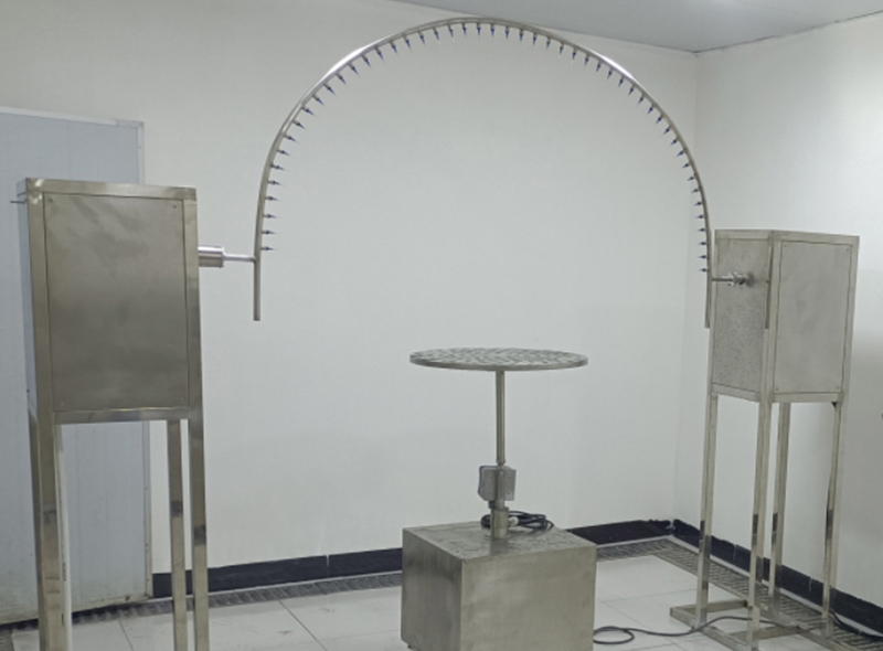 樣品放置:將樣品放在試驗臺上面,使其噴水口的距離樣品表面約200mm,試驗轉(zhuǎn)臺不旋轉(zhuǎn)。 試驗條件:擺管夾角180°噴水孔噴水噴向樣品。樣品放在擺管半圓中心。擺管兩邊各擺動160°,共約320°。每次擺動(2×360°)約12s。