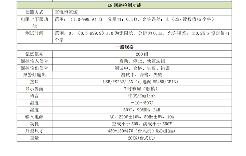 f)多項(xiàng)支持:LN回路測(cè)試、開(kāi)路偵測(cè)功能、快速啟動(dòng)測(cè)試、電弧測(cè)試;