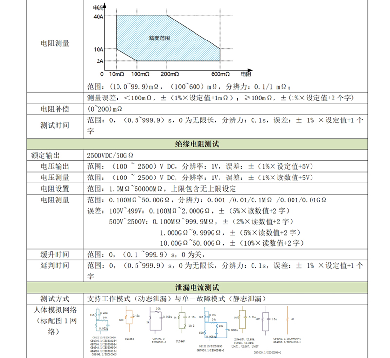 d)接地阻抗:40A/600mΩ,滿足醫(yī)療器械行業(yè)R<100mΩ的測(cè)試要求;