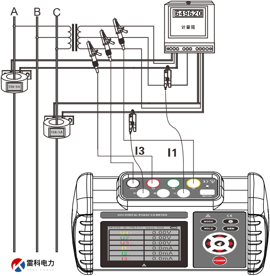 Reke2020三相交流電壓表電流、電壓間相位、電流間相位、電壓電流間相位、頻率、有功功率、無功功率、視在功率、功率因數、三相電流矢量和,判別相序、感性、容性電路等。測試接線如下: